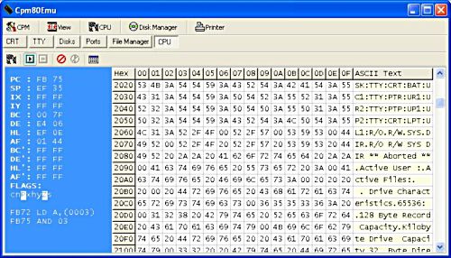 After starting the Z80Emu program the software can be used to execute CPM or be used as a simple Z80 emulation system. When the program starts up the CPU is in halt mode.