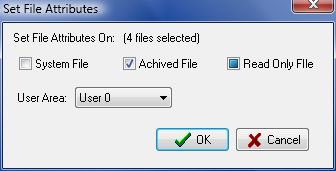 The set file attributes dialog has been slightly altered to better work with multiple files. The Read-Only, Archive, and System attribute check boxes allow the selection of the "grayed" state to indicate that the selected file attribute should be left as it currently is on each file in the selected group. The grayed state is only relevant if a group of selected files do not all have a given attribute set to the same value initially. The "user Area" setting can now be set to "No Change" to keep the User Area setting for each file in a selected group of files unchanged. Selecting any other user area setting will set all selected files to the new user area.